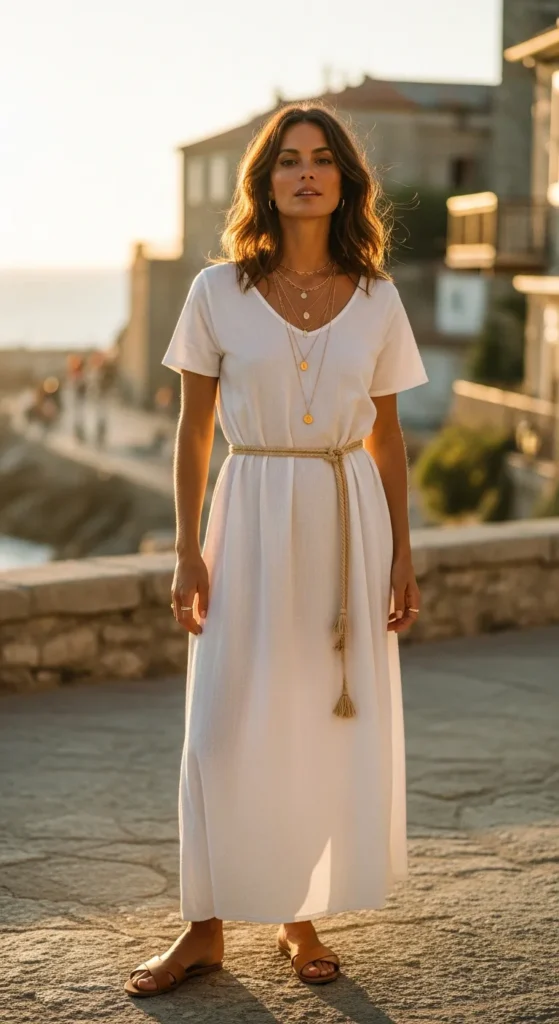 A crisp white cotton maxi dress that floats as you walk, cinched softly with a rope belt for shape. It feels fresh, feminine, and endlessly breathable for warm summer days.