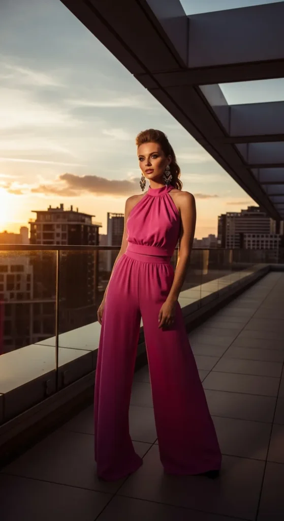A halter neck top paired with palazzo pants creates an elegant yet relaxed summer silhouette. It feels cool, confident, and effortlessly boho.