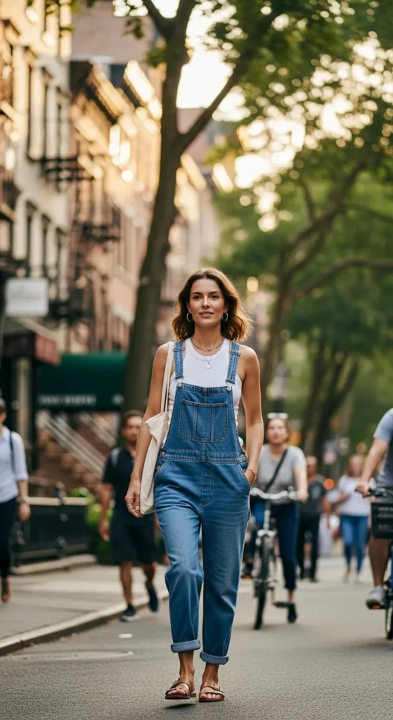 Summer friendly overalls layered over a fitted tank feel playful and relaxed without being childish. The look is casual but thoughtfully styled.