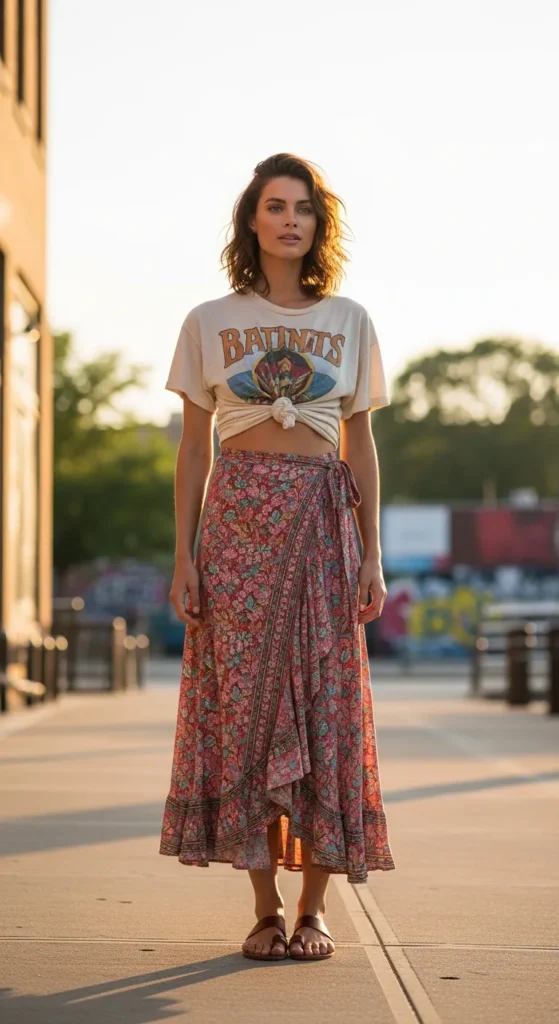 A relaxed graphic tee tucked into a flowy wrap skirt blends casual comfort with feminine movement. It feels laid back yet thoughtfully styled.