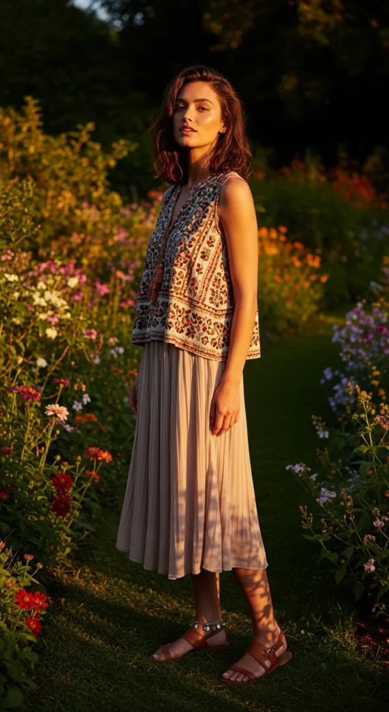A sleeveless boho top paired with a soft midi skirt feels romantic and wearable. The movement makes it perfect for warm breezy days.