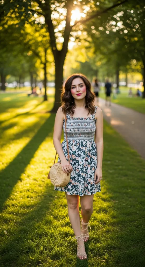 A smoked sundress hugs comfortably while still feeling breezy. Paired with tie-up sandals, it gives soft boho romance with a modern edge.