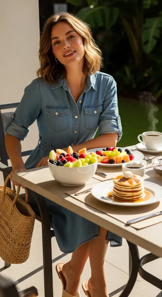 A chambray dress feels effortlessly cool and perfect for summer mornings. The denim-like fabric adds texture while remaining lightweight enough for warm, sunny breakfasts.