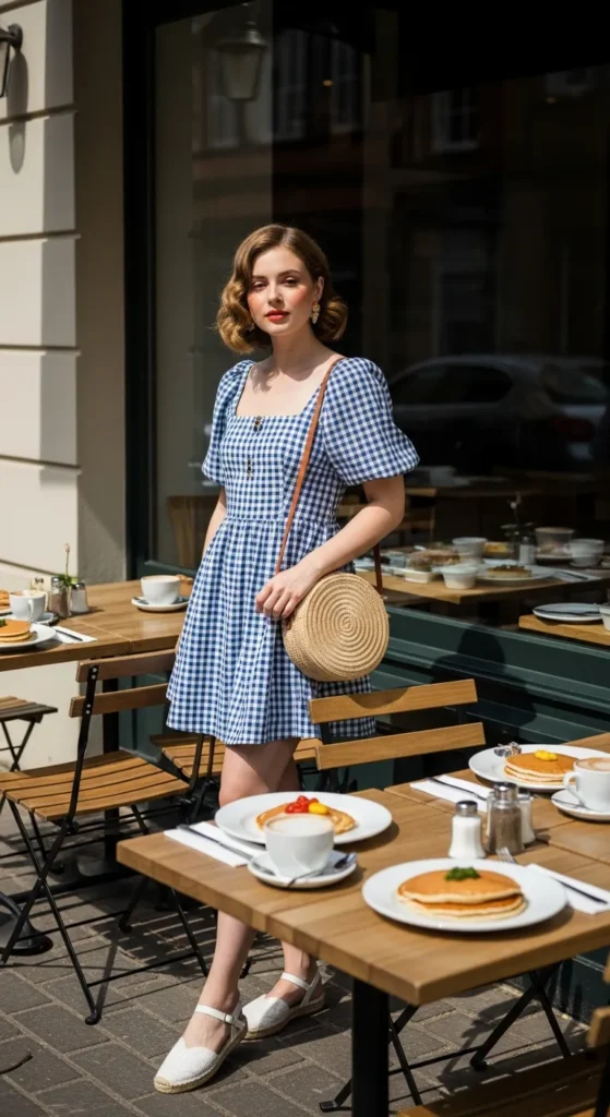 A soft gingham mini dress gives off classic summer picnic energy. The playful pattern feels nostalgic and cheerful, making it perfect for cozy diner breakfasts, fresh fruit bowls, and sunny morning strolls afterward.