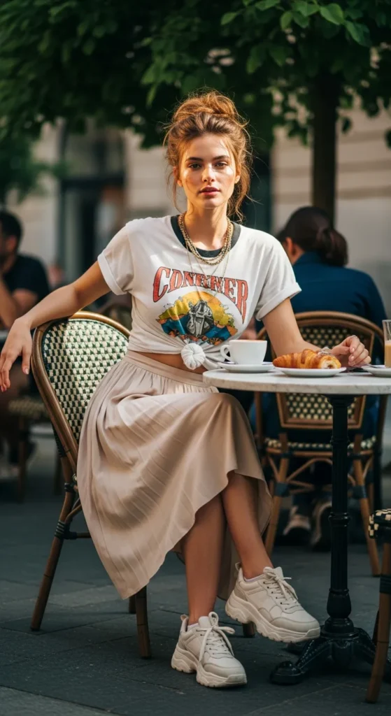 A casual graphic tee paired with a flowing midi skirt balances playful and feminine elements perfectly. It’s a relaxed outfit that still feels styled for a casual breakfast with friends.