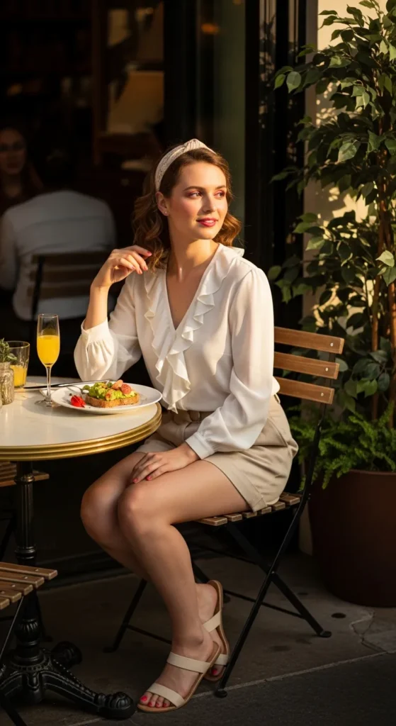 A ruffle blouse instantly adds charm to a simple breakfast outfit. Paired with light cotton shorts, the look feels feminine, airy, and ideal for warm summer mornings.