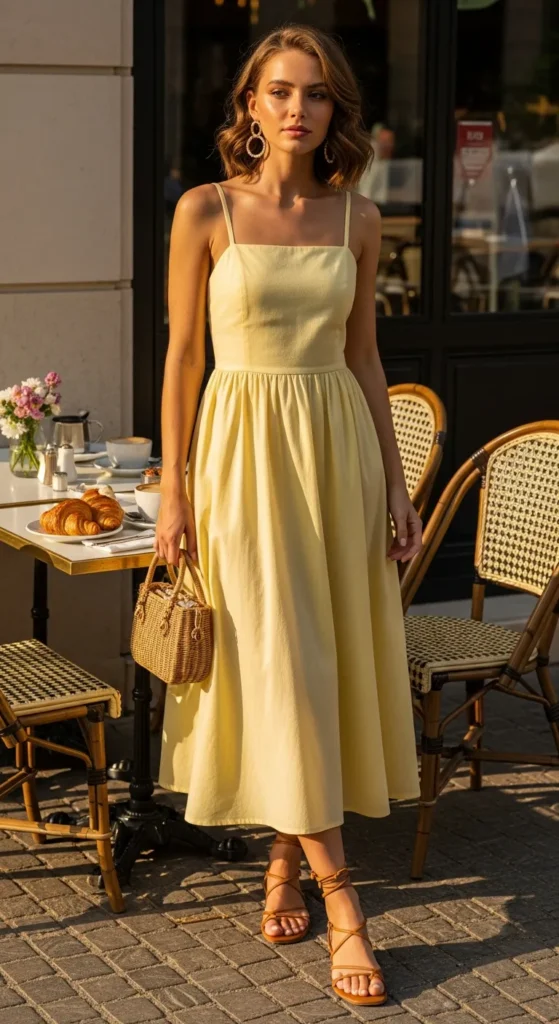 A soft lemon sundress instantly captures the warmth of a summer morning. The light cotton fabric feels breezy, while the cheerful pastel shade reflects the sunshine beautifully during relaxed café breakfasts or patio coffee dates.