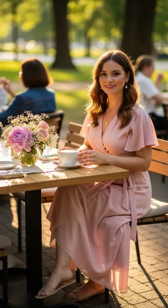 A soft pink wrap dress creates a romantic and flattering look for a relaxed breakfast date. The flowing silhouette moves beautifully in the morning breeze while the color keeps the mood light and feminine.