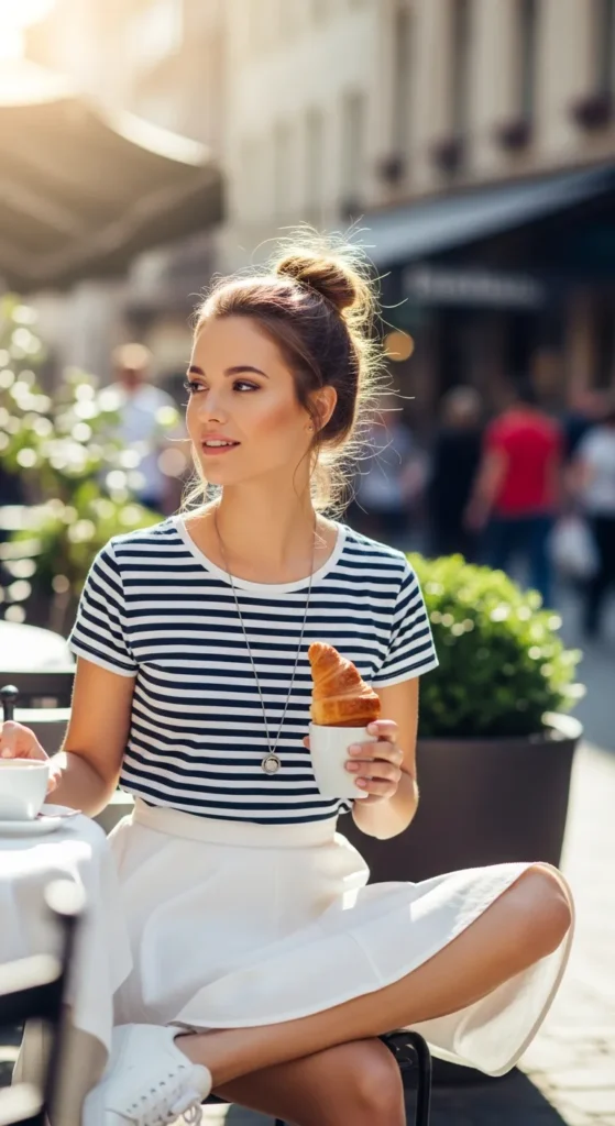 A classic striped tee paired with an airy A-line cotton skirt gives off relaxed Parisian breakfast energy. It feels playful yet comfortable for slow mornings spent chatting over coffee and pastries.