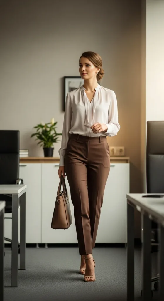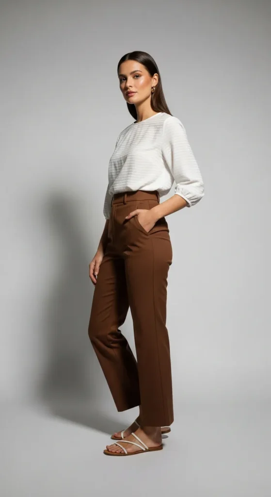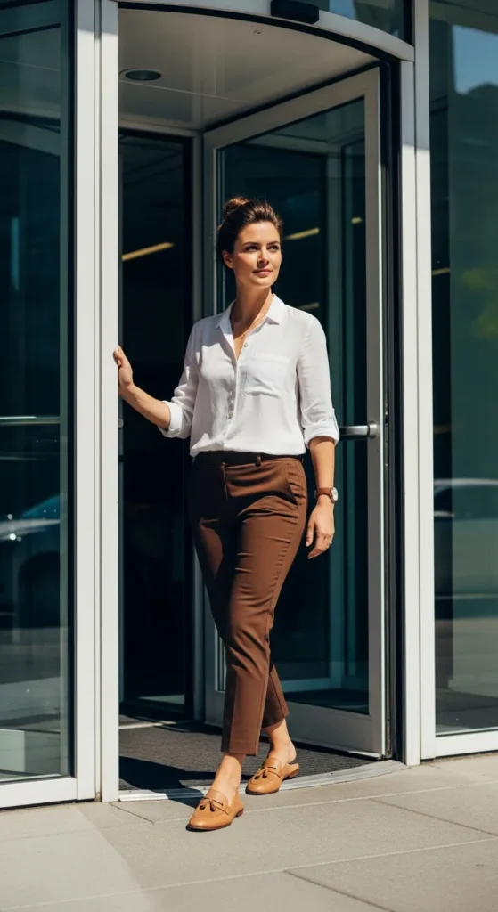 Brown pants styled with a lightweight blouse create a summer office outfit that feels professional yet breathable, ideal for long days that still demand style.