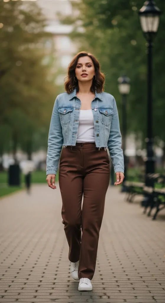 Brown pants styled with a cropped denim jacket offer a playful summer contrast that feels youthful and practical, especially for cooler mornings or late evening plans.