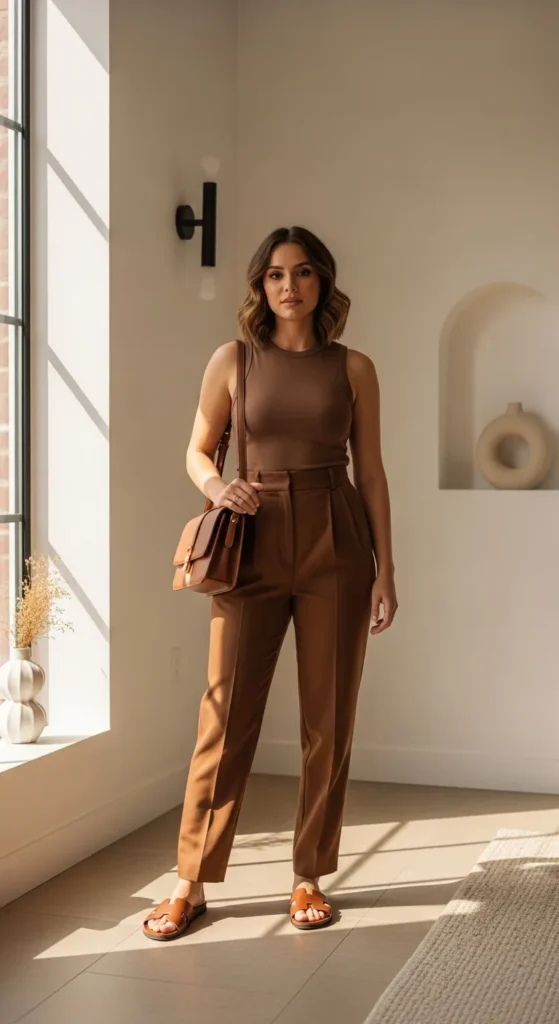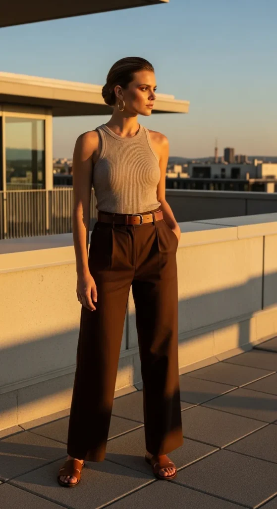 Brown pants paired with a ribbed neutral tank create a clean summer silhouette that feels modern, confident, and grounded, perfect for days when less truly feels like more.