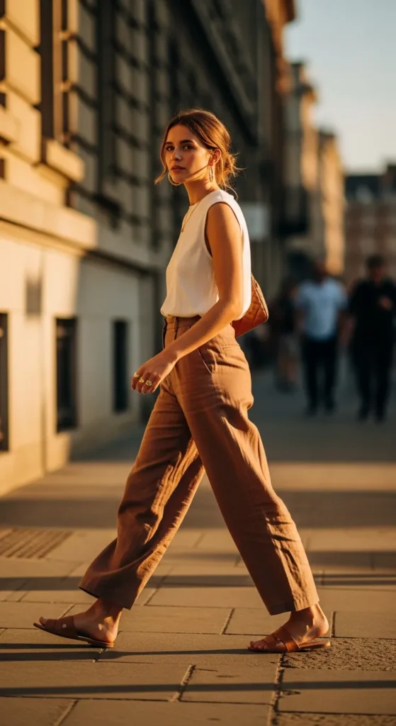 Light brown linen pants paired with a creamy sleeveless top create an airy, calm summer look that feels breathable and relaxed while still looking intentional and quietly elevated for everyday warm-weather plans.