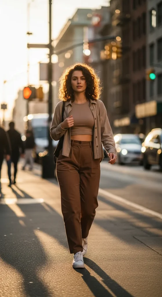 Brown pants paired with a simple crop top create a confident, balanced summer look that feels youthful but grounded, perfect for casual weekends or relaxed outings.
