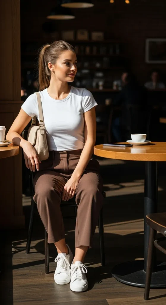Tailored brown pants styled with a crisp white tee deliver a clean, confident summer outfit that feels casual yet put-together, perfect for days when comfort matters but style still feels personal.