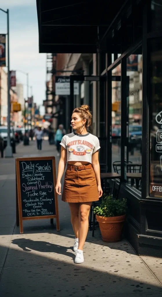 A slightly cropped vintage-inspired graphic tee paired with a high-waisted brown A-line skirt blends playful and polished. It’s casual but styled, perfect for coffee runs or casual hangouts where you still want to look intentional.