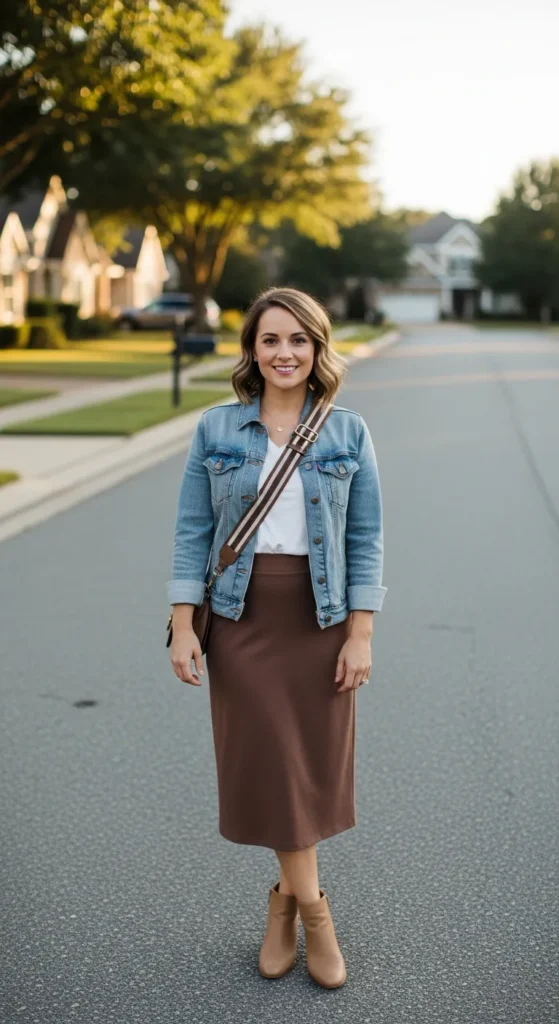 Layer a light wash denim jacket over a simple white tee and mocha brown skirt for a laid-back but styled look. It’s practical for breezy evenings without sacrificing personality.