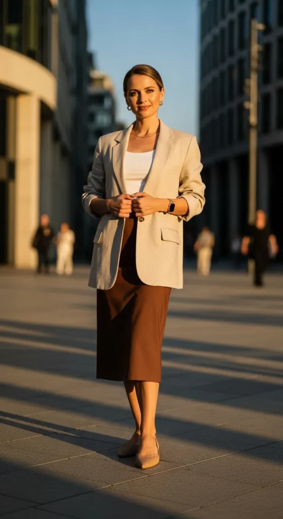 A lightweight summer blazer layered over a tank and brown skirt feels confident and smart without being heavy. Perfect for meetings, brunches, or semi-formal occasions.