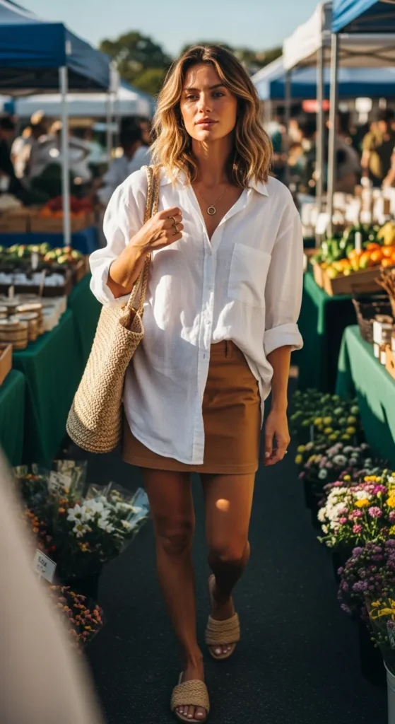 A slightly oversized white linen button-down paired with a camel brown mini skirt feels breezy and effortlessly cool. Rolled sleeves and a relaxed tuck keep it light and perfect for warm summer days.