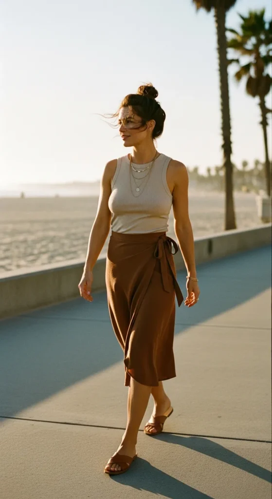A simple beige tank styled with a brown wrap skirt creates subtle movement and shape. The wrap detail adds interest while keeping the overall look relaxed and flattering.