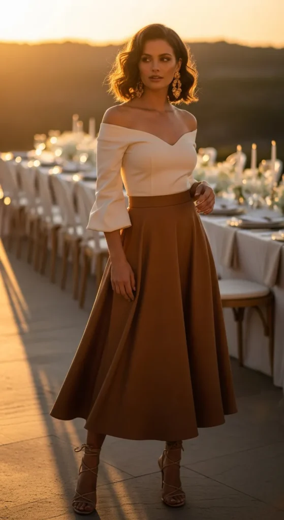 A soft off-shoulder top paired with a warm brown midi skirt feels feminine and perfect for summer evenings. The neckline draws attention upward while the skirt flows effortlessly.