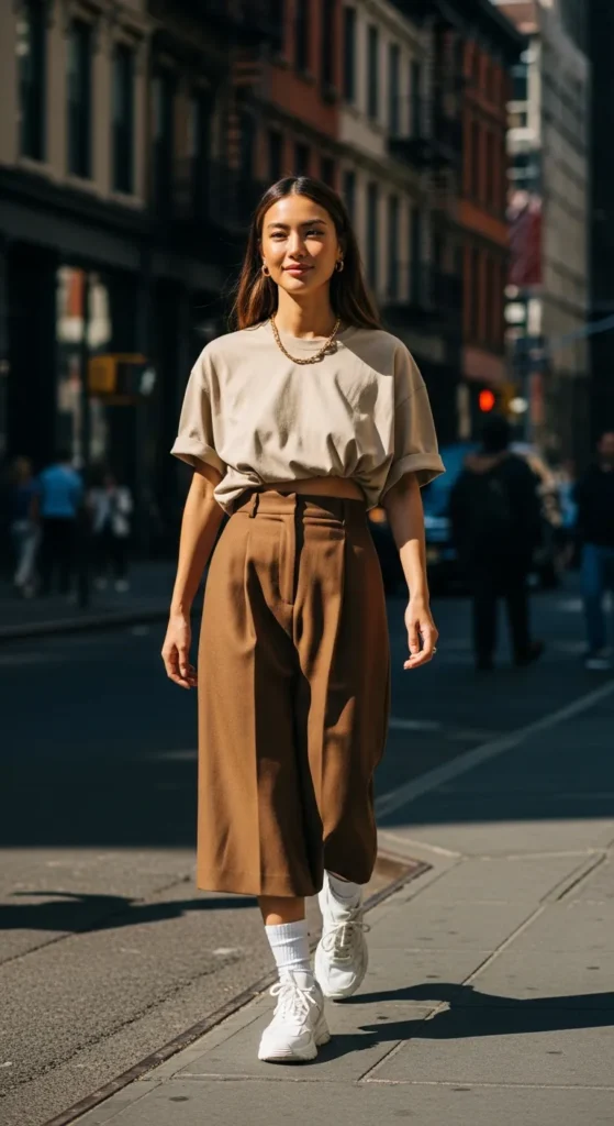 An oversized neutral tee half-tucked into a structured brown skirt blends relaxed and tailored energy. The mix feels modern and comfortable for everyday wear.