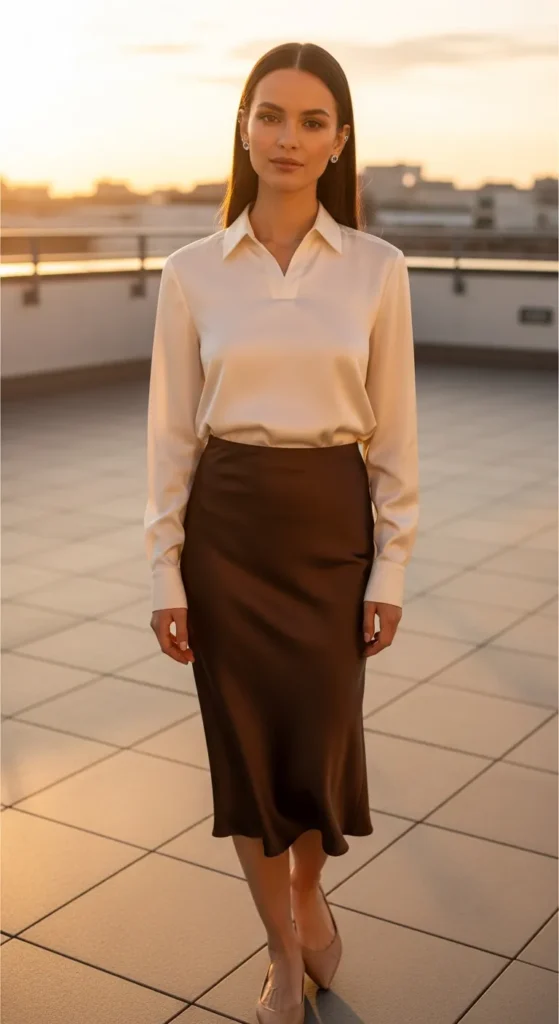 A silky cream satin blouse tucked into an espresso brown slip skirt creates soft movement and understated elegance. The fluid textures feel cool against summer heat while maintaining a refined, grown-up vibe.
