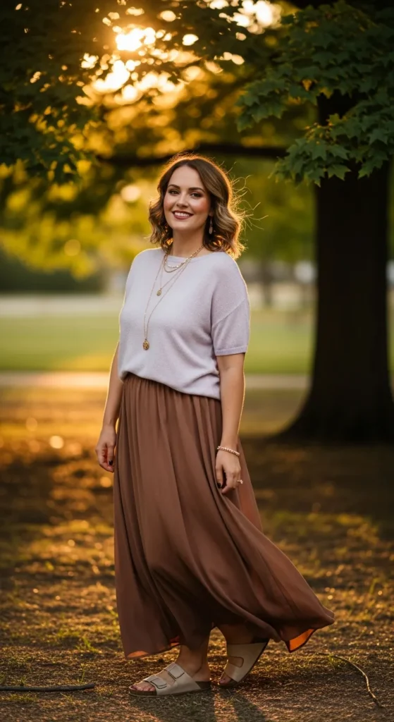 A lightweight pastel knit top tucked into a coffee brown maxi skirt feels cozy yet breathable. The contrast between soft color and deep brown creates a gentle, romantic summer mood.