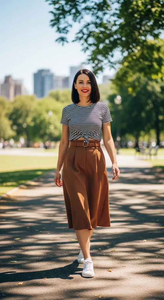 A classic striped tee tucked into a toffee brown skirt delivers timeless summer charm. The stripes feel fresh, while brown keeps it warm and sophisticated.