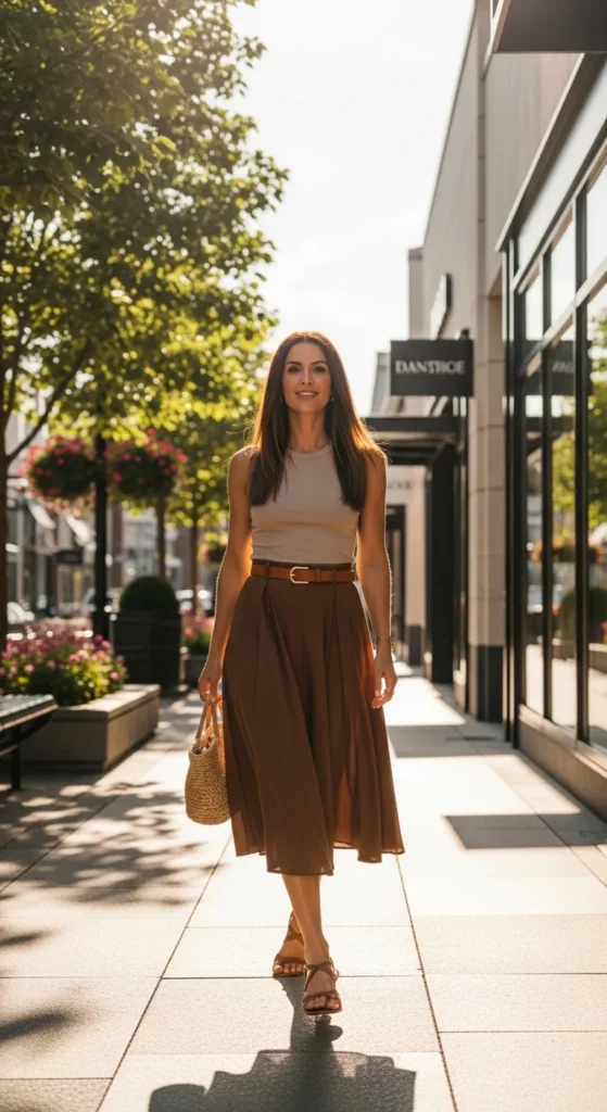 A fitted tank tucked into a belted brown skirt defines the waist and creates a flattering silhouette. It’s simple yet polished for daytime events or casual meetings.