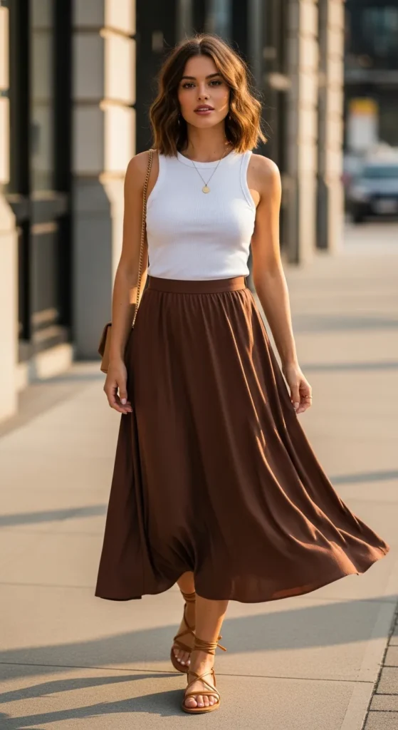 A fitted white ribbed tank tucked into a flowy chocolate brown midi skirt feels simple yet quietly striking. The clean contrast keeps it summery, while the rich brown tone adds depth and maturity to an everyday look.