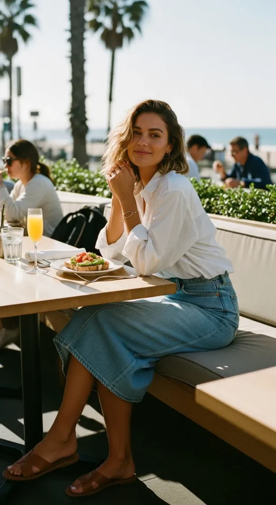 A classic denim midi skirt paired with a slightly oversized white button-down feels timeless and fresh. The combination is relaxed yet intentional, ideal for casual brunch spots with patio seating.