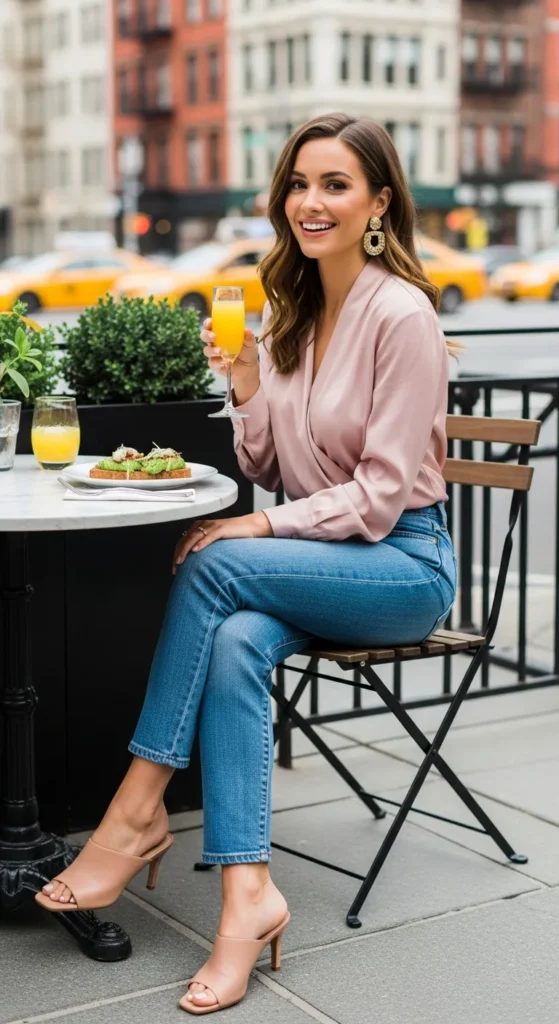 A silky satin blouse tucked into straight-leg jeans blends casual and elevated perfectly. The subtle sheen adds polish, making even denim feel date-ready.