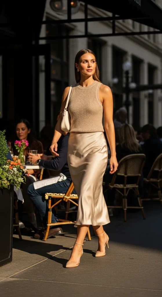 A silky slip skirt styled with a fitted knit tank creates that effortless chic brunch energy. The contrast of textures, smooth satin and soft knit feels modern and flattering without being overdone.