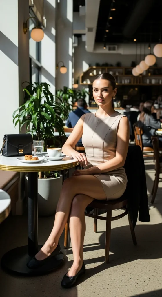 A simple structured mini dress in neutral tones feels polished and confident. It’s playful yet clean, ideal for a stylish café where you want to look effortlessly put-together.