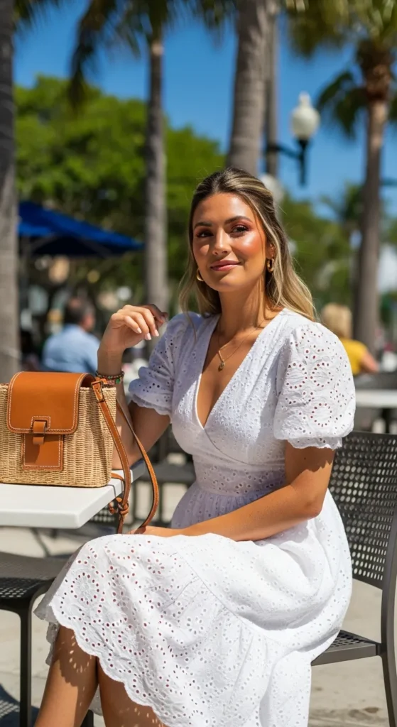 A white eyelet dress feels airy, romantic, and classic for summer brunches. The delicate cut-out texture catches sunlight beautifully while remaining soft and feminine.