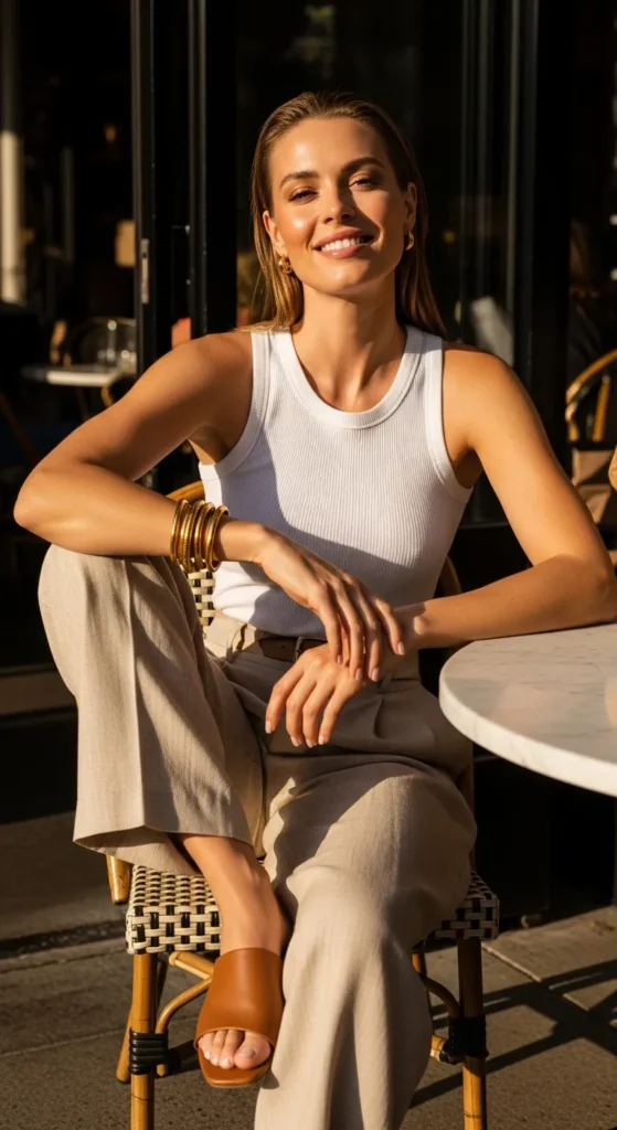 A crisp white tank paired with wide-leg linen trousers feels clean, modern, and effortlessly chic. It’s minimal but powerful perfect for confident, laid-back brunch energy.