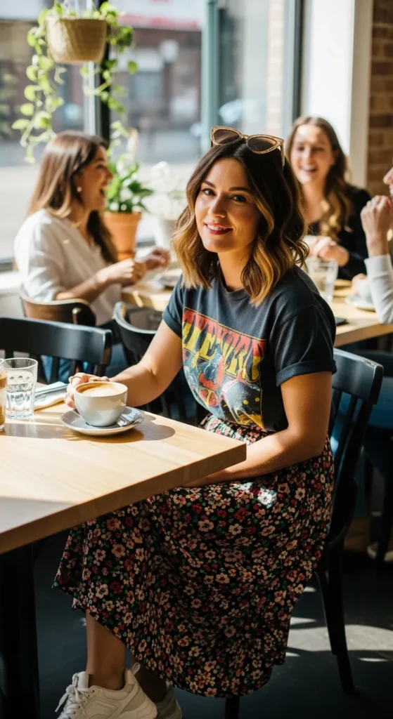 A casual graphic tee paired with a feminine midi skirt gives you that cool-girl brunch energy. It’s relaxed but still thoughtfully styled.