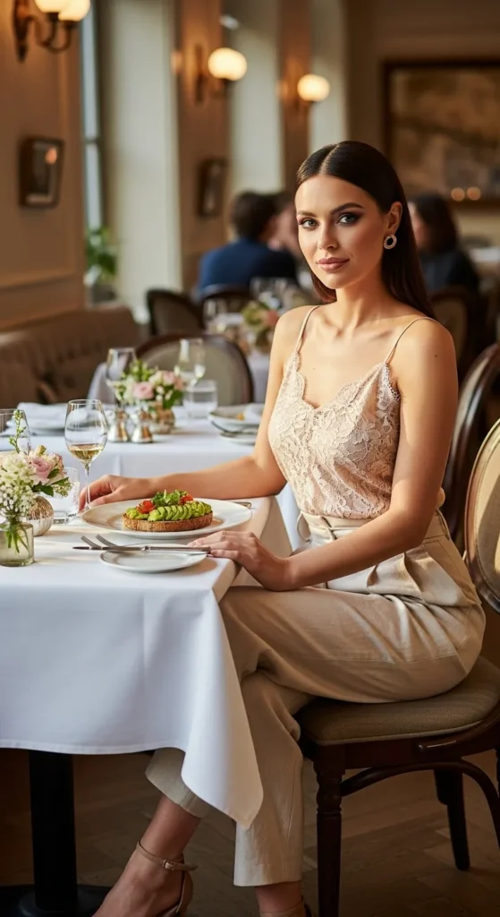 A soft lace camisole paired with linen trousers feels elevated yet breathable. It’s perfect for a slightly dressier brunch setting.