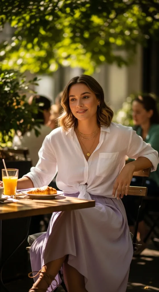 Light, breathable linen paired with a soft, flowy midi skirt creates that easygoing brunch vibe. It’s polished without trying too hard, and perfect for warm mornings that turn into sunny afternoons.