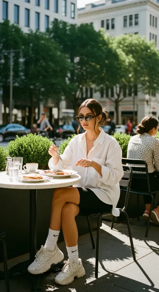 An oversized shirt styled with biker shorts is modern, comfy, and perfect for casual brunch hangouts. It feels relaxed but still fashion-forward.