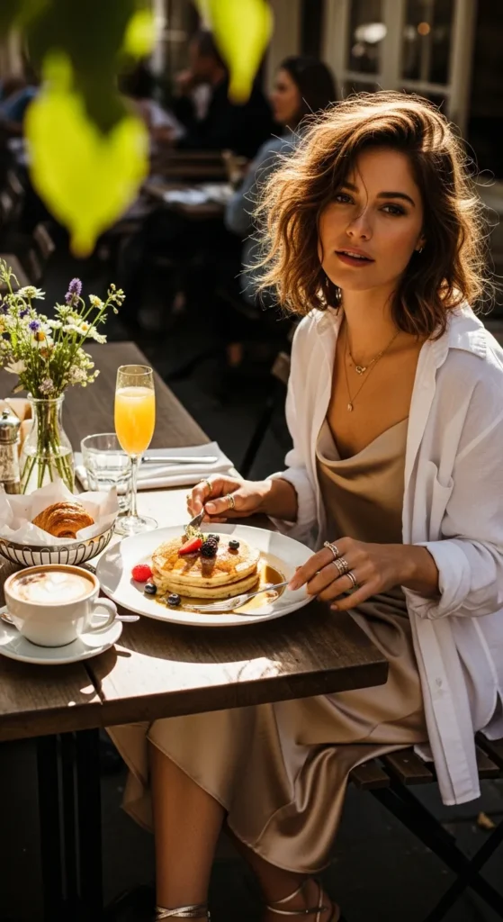 A silky slip dress layered with a loose shirt creates dimension while keeping things breezy. It’s perfect for transitioning from morning coffee to an afternoon stroll.