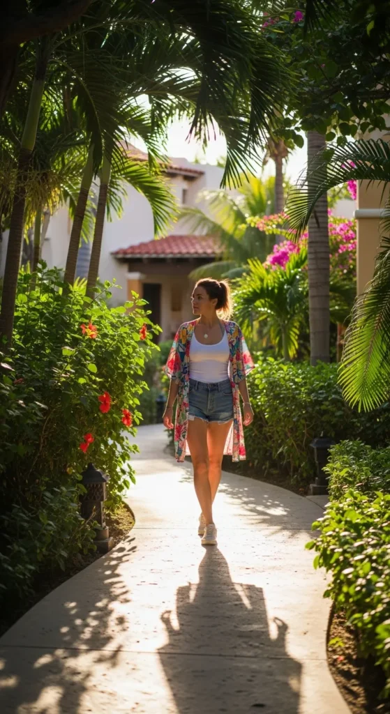 A lightweight patterned kimono layered over a fitted tank and denim shorts feels casual yet styled for daytime resort exploring. It adds movement without trapping heat.
