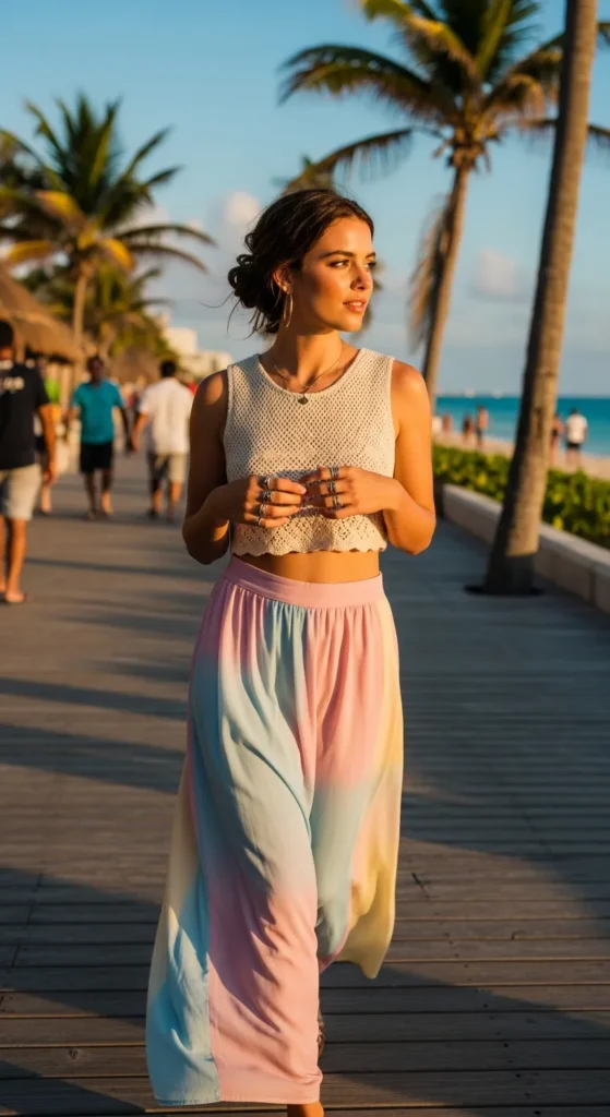 A breathable crochet top paired with a soft flowing skirt creates a dreamy beach-to-bar outfit that feels artistic and feminine.