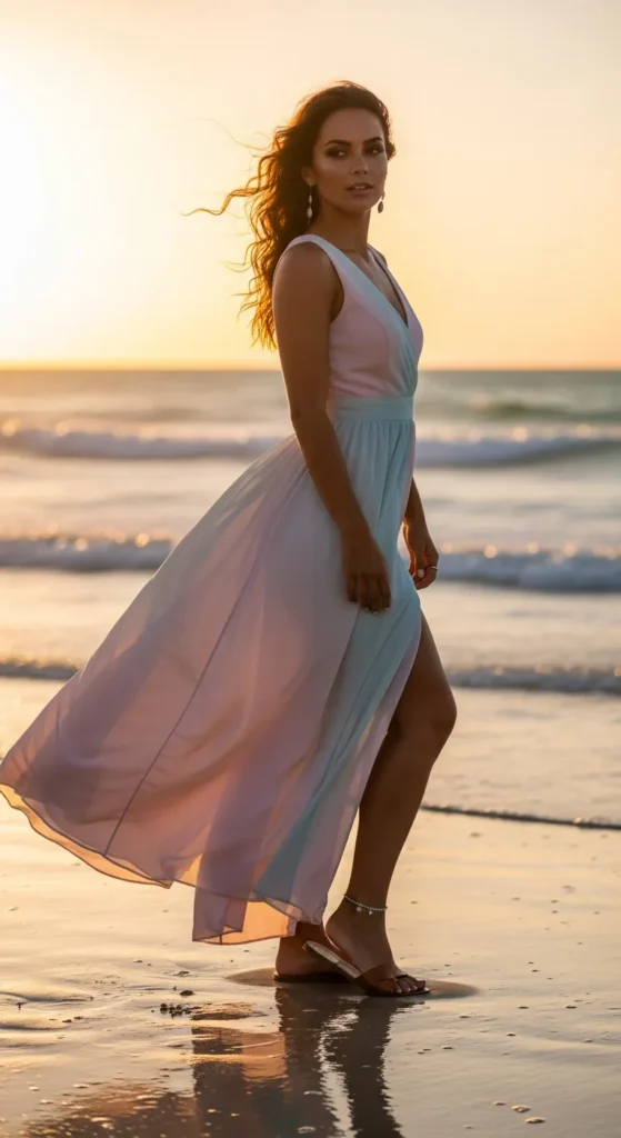 A lightweight maxi dress with a subtle side slit feels dramatic yet breathable. It moves beautifully in the coastal breeze and photographs like a dream during golden hour.