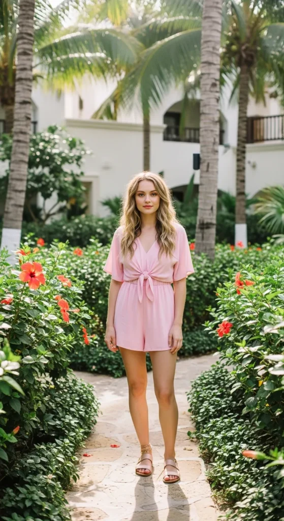 A pastel romper with a defined tie waist is playful and flattering for resort mornings. It’s comfortable yet polished enough for photos.