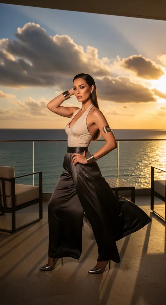 Flowing silky pants with a fitted halter top balance comfort and sophistication for evening events. The movement feels luxurious yet effortless.