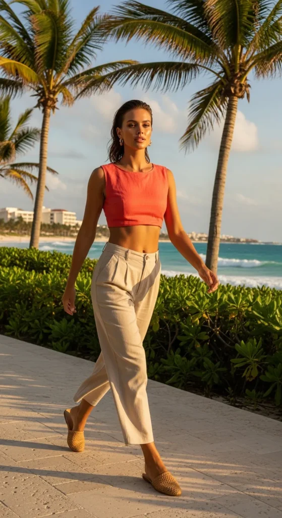 A soft coral linen crop top paired with high-waisted wide-leg pants feels fresh, confident, and effortlessly chic for resort dinners. The airy texture moves beautifully in the breeze while keeping you cool under golden Cancun sunsets.