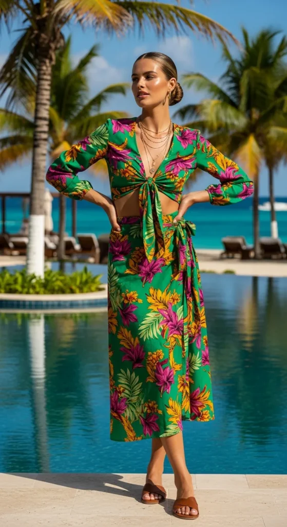 A breezy wrap skirt in a subtle tropical print paired with a matching cropped blouse feels playful without being loud. It’s perfect for strolling resort boutiques or grabbing cocktails by the pool.