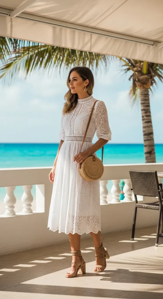 A white eyelet midi dress with subtle cutwork detailing feels romantic yet relaxed for brunch by the ocean. The breathable cotton keeps you cool while the texture adds soft elegance without feeling overdressed.